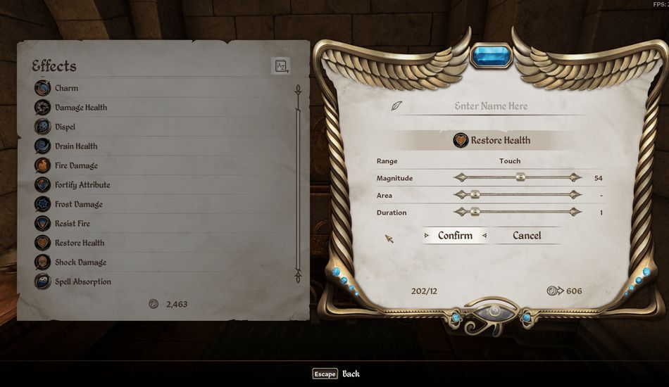 Depois de estar satisfeito com as propriedades de um efeito, clique em "Confirmar" para adicioná-lo à sua magia. Você pode adicionar vários efeitos, mas esteja ciente de que alguns efeitos exigem níveis de habilidade específicos. Por exemplo, você precisará do nível 50 de Restauração para criar magias de Restaurar Saúde.