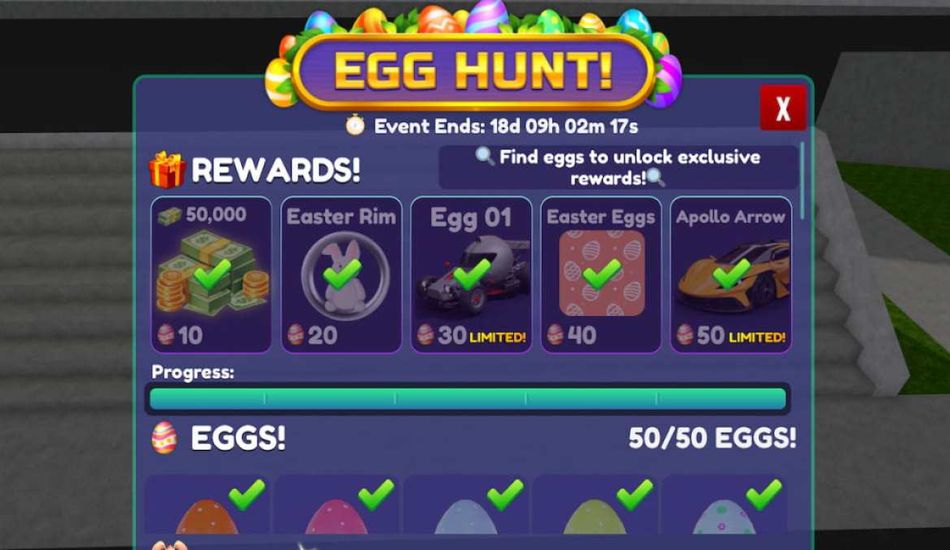 Há um total de 50 ovos coloridos para descobrir em Vehicle Legends. Você pode monitorar seu progresso clicando ou tocando no ícone da cesta de ovos localizado na barra lateral do seu jogo. Isso exibirá uma lista de recompensas, seu número total de ovos coletados e a opção de concluir instantaneamente o evento por 600 Robux.